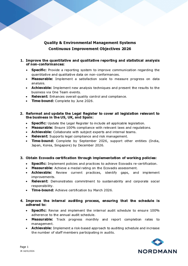 Quality & Environmental Management Systems Continuous Improvement Objectives 2025 (Nordmann UK)